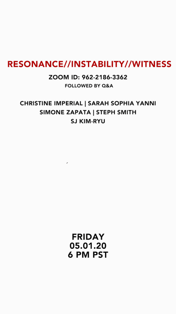 Resonance/Instability/Witnes, features MFA CWP students Steph Smith, Christine Imperial, Simone Zapata, Sarah Yanni and Shirley Kim-Ryu. Through the subjectivity of an immigrant daughter, Sarah Sophia Yanni will explore how poetry can be a pathway to sense-making within forms of chaos. Writing within/through the hyphenated identity of a Filipino-American, Christine Imperial will investigate both the promise and grief of ambivalence for the post-colonial poet. In its correspondence between objects, relationships, and time, Simone Zapata will discuss the colon and its shift away from equivalence and towards resemblance. Steph Smith will present a nascent theory of the fourth person which explores the strategic destabilization of the subject position within the text. SJ Kim-Ryu will address post-colonial queerness as the final process of liberation for all.