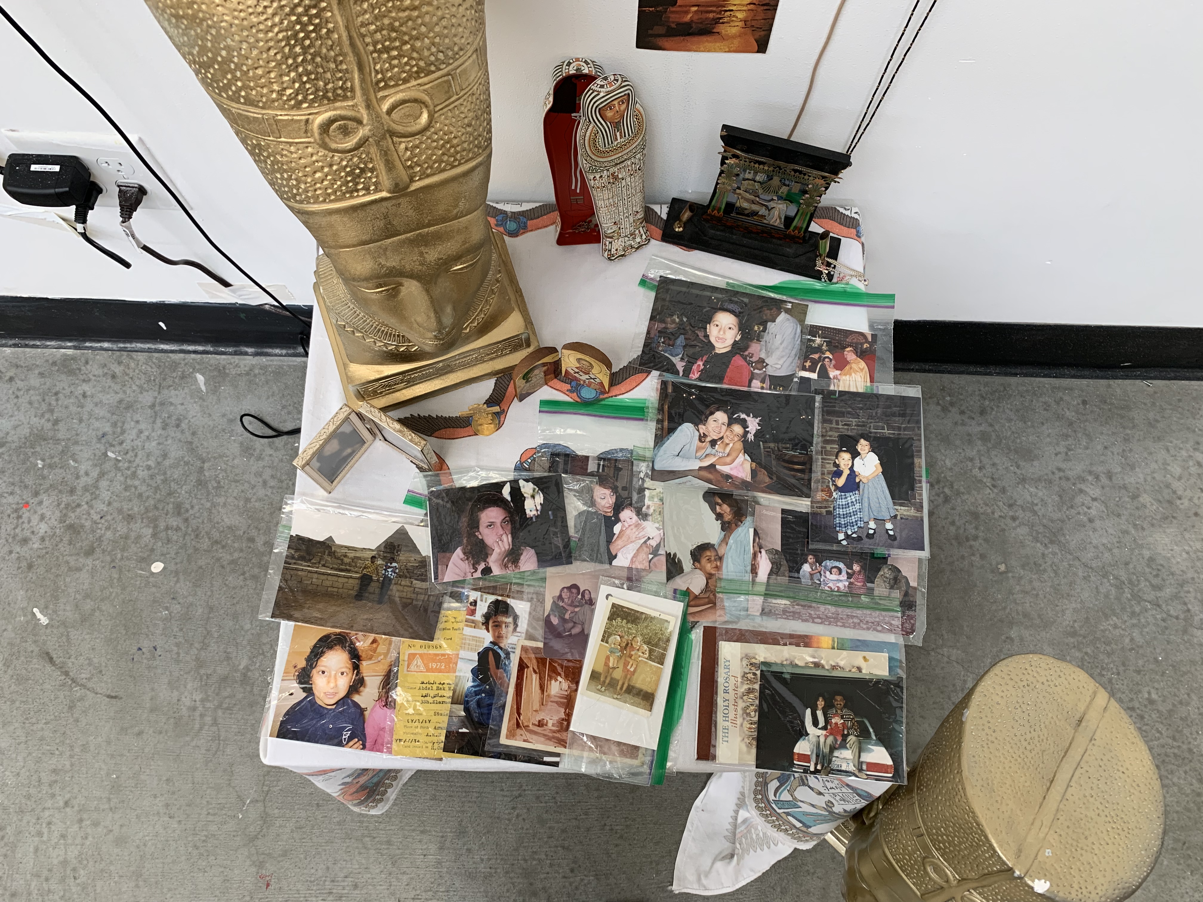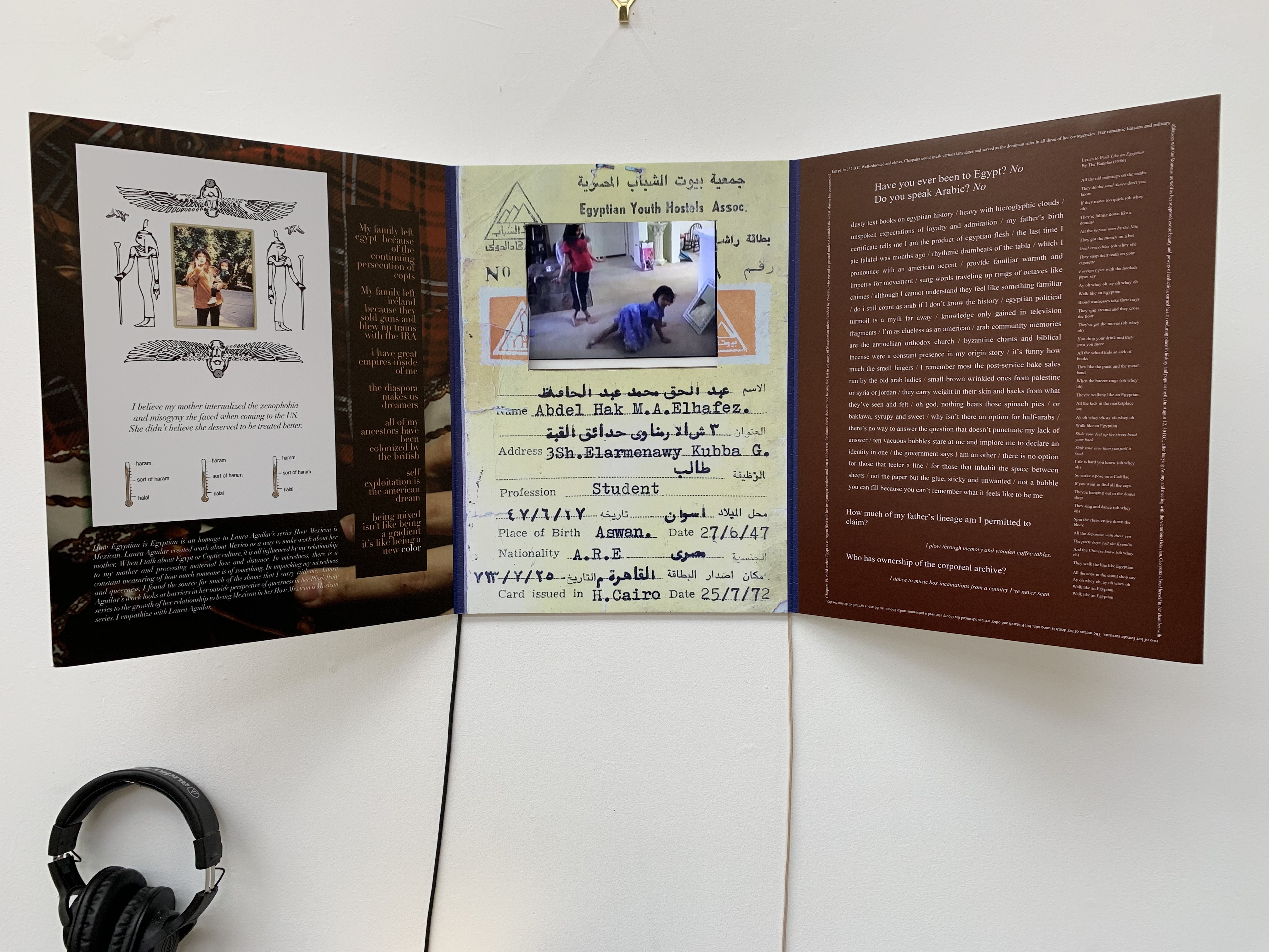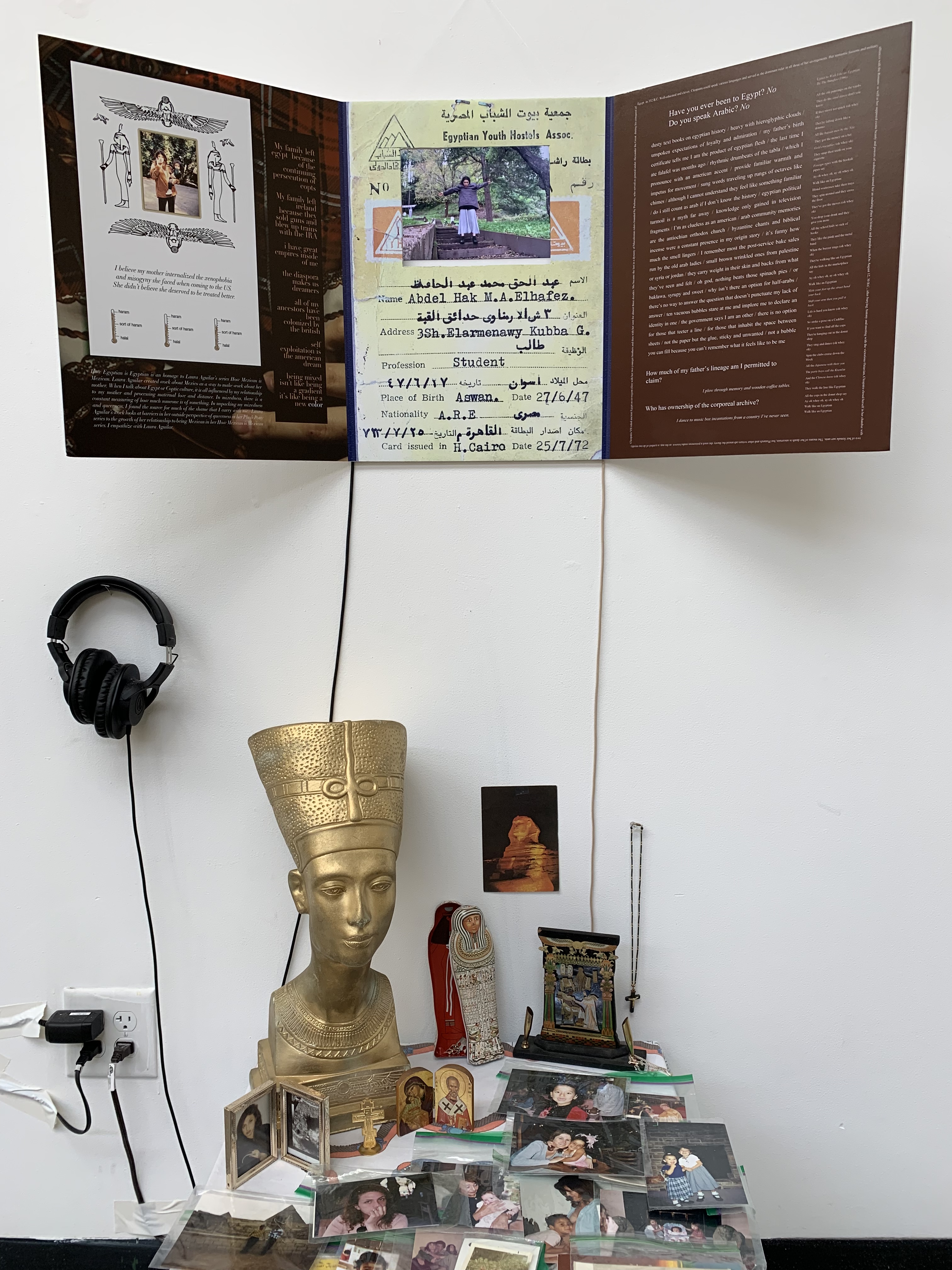 statement: yanni, hafez, & abadir-mullaly constructed an installation together that discusses a mixed relationship to egyptian culture. through image, video, text and objects, the three investigate their shared status as mixed race egyptians. using childhood memories, religion, gender, and similar topics as a point of departure, hbb investigates what it means to inhabit a partial and liminal cultural space.